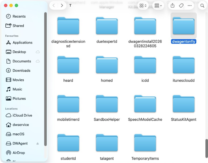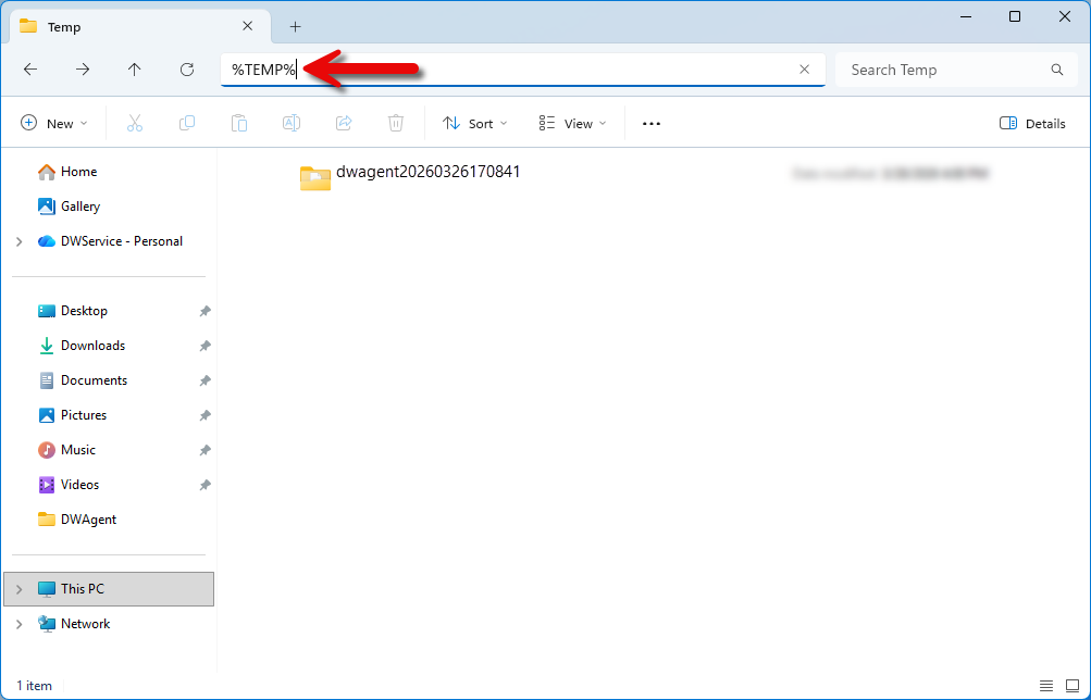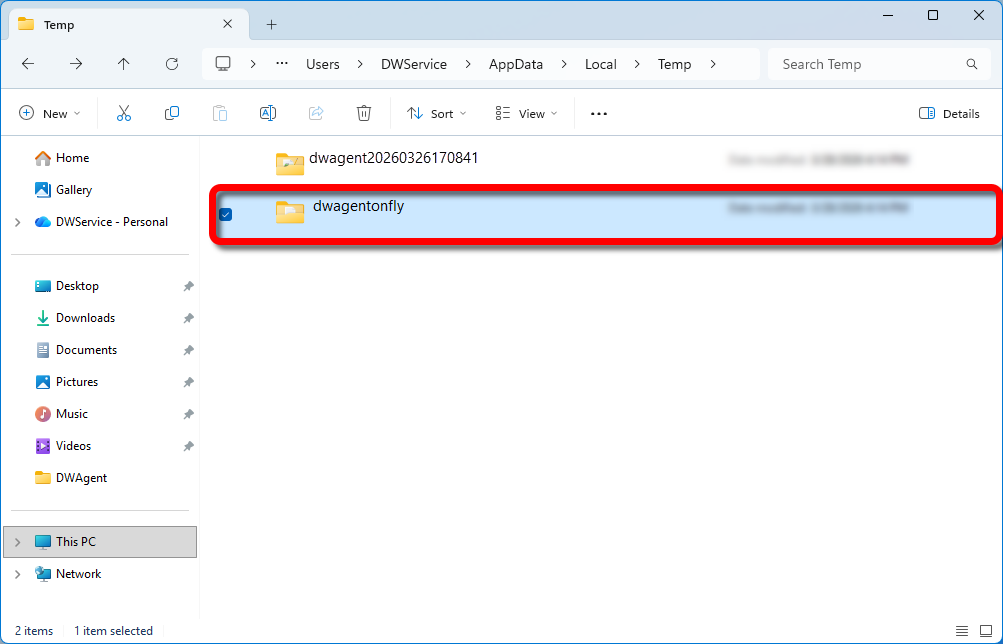 There you will see the temporary dwagent folder. For example, as shown in the screenshot: dwagent20260326170841